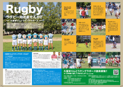 一番おもしろかった(興味が持てた)記事はラグビーのページでした。今、話題になっているスポーツではありますが、ルールや詳しいことが全く分かってなかったので、今回の記事を読んで、少しはラグビーのことを知ることができ、ぜひ、ワールドカップのキャンプ地に久留米がなってほしいと思いました。